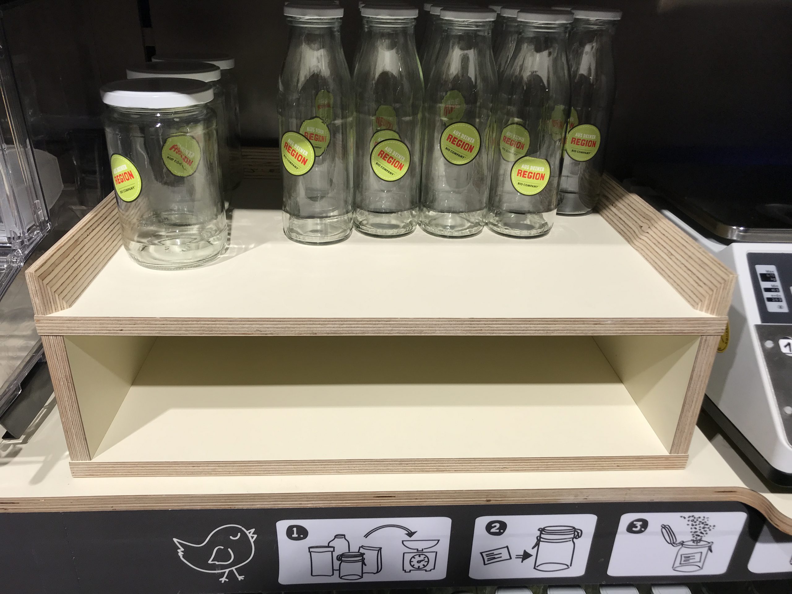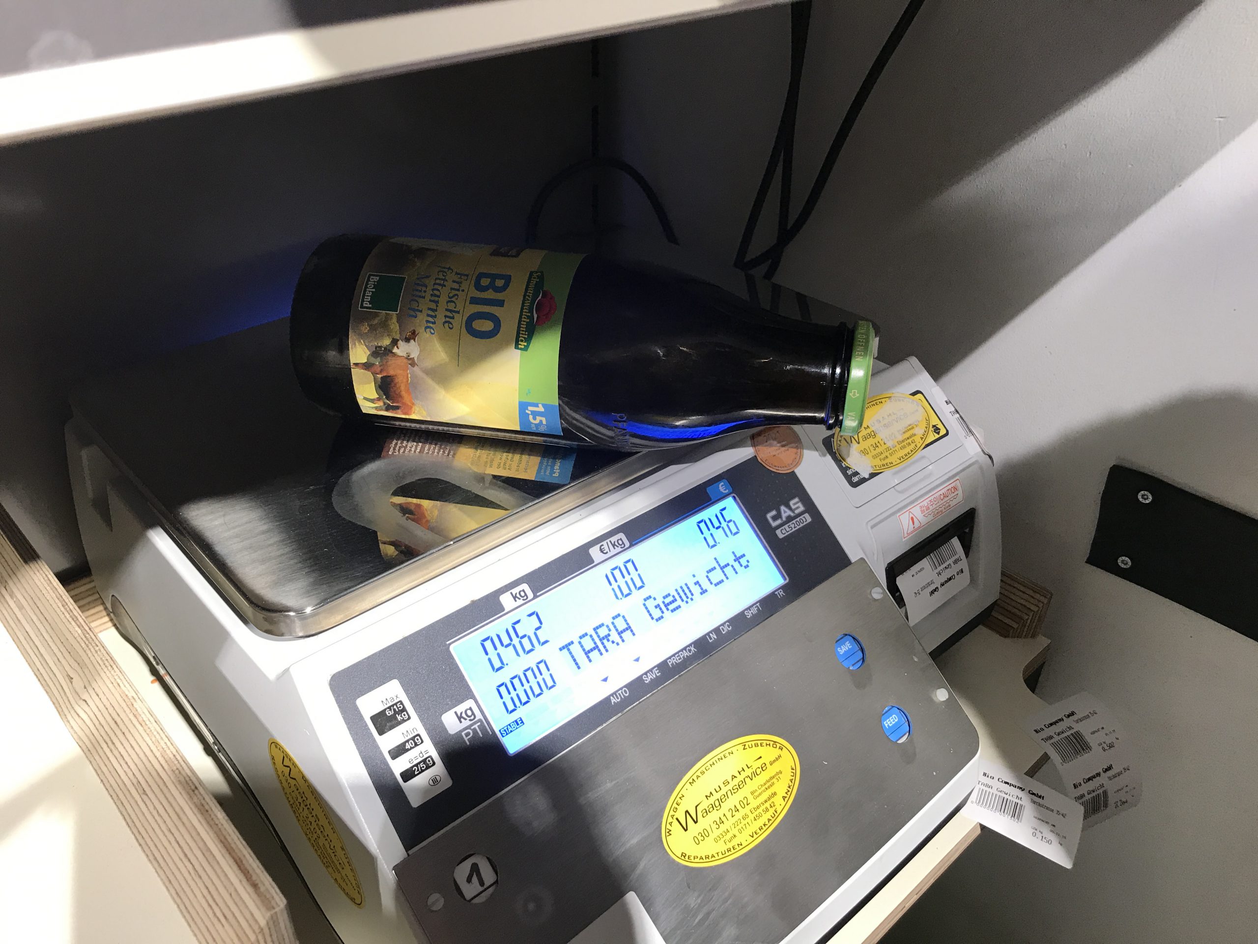 Finally, our absolute favorite: milk on the tab. You bring your own bottle or you get one from the shop and fill it with milk. You measure the bottle before and afterwards, so that you pay only for the amount of the milk, not also for the weight of the bottle.